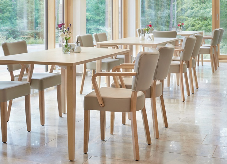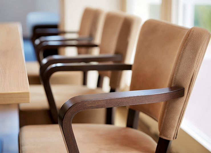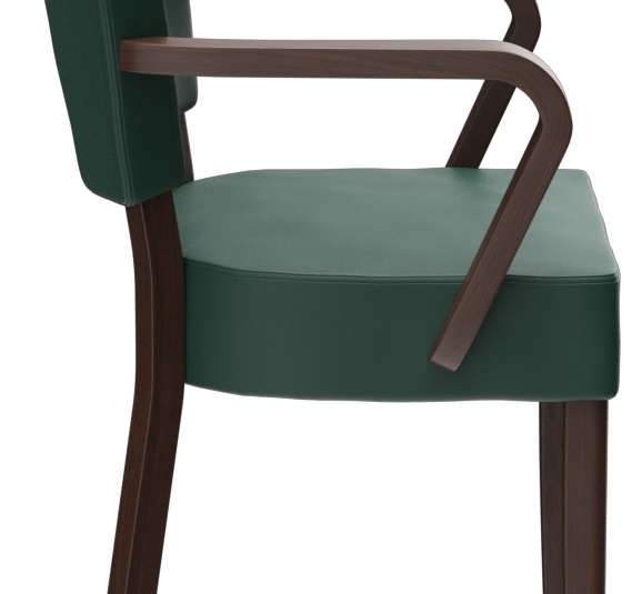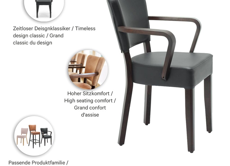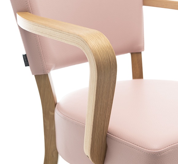 Grâce à ses formes douces et au rembourrage souple, le modèle Damara convient autant aux restaurants qu’aux bars. Damara est disponible en bois de hêtre dans les couleurs naturelle, noyer et noire, ainsi qu'en bois de chêne naturel. Comme cette série fait partie de la collection de tissus, elle est disponible dans de nombreuses variantes de couleurs et de revêtements.