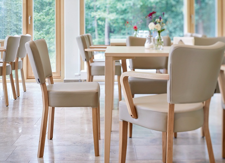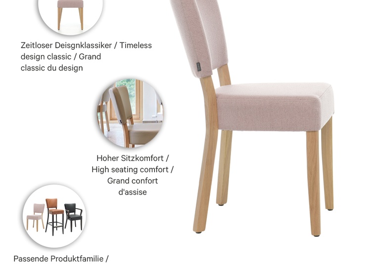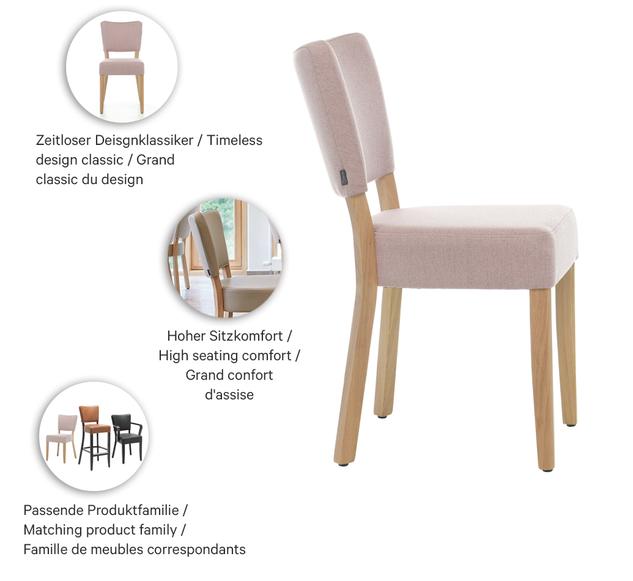 Grâce à ses formes douces et au rembourrage souple, le modèle Damara convient autant aux restaurants qu’aux bars. Damara est disponible en bois de hêtre dans les couleurs naturelle, noyer et noire, ainsi qu'en bois de chêne naturel. Comme cette série fait partie de la collection de tissus, elle est disponible dans de nombreuses variantes de couleurs et de revêtements.Numéro d'article