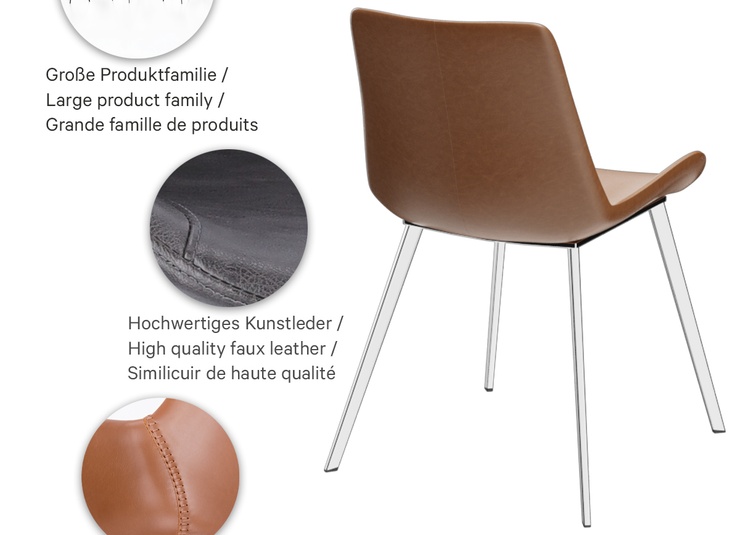 Chaise professionnelle pour la gastronomie avec revêtement en cuir synthétique facile d’entretien au look vintage caractéristique et coutures décoratives précises pour une apparence élégante. Les surfaces d’assise et de dossier ergonomiquement conçues avec un rembourrage confortable offrent un confort perceptible – même lors de longues périodes d’assise. Le cadre robuste en acier peint par poudrage assure une stabilité fiable, est résistant aux rayures et facile à nettoyer au quotidien. Trois couleurs de cuir synthétique soigneusement assorties s’intègrent harmonieusement dans presque tous les environnements. Disponible en chaise, fauteuil et tabouret de bar – pour un langage design cohérent du restaurant au bar.