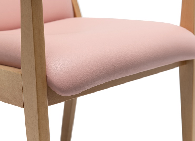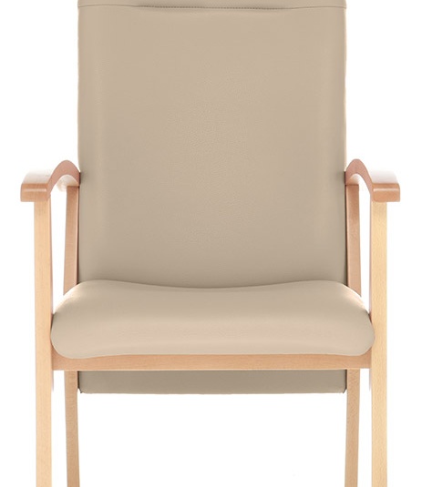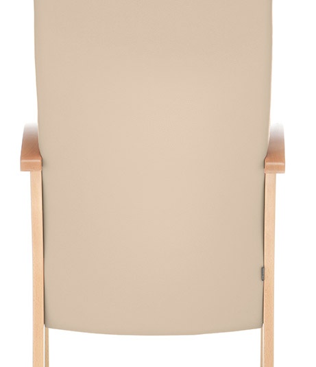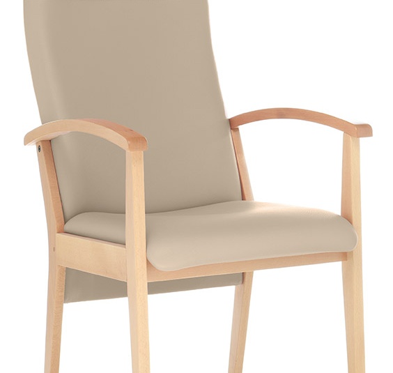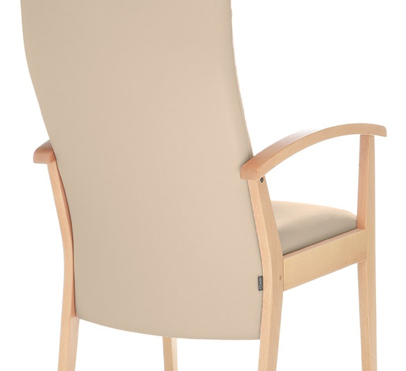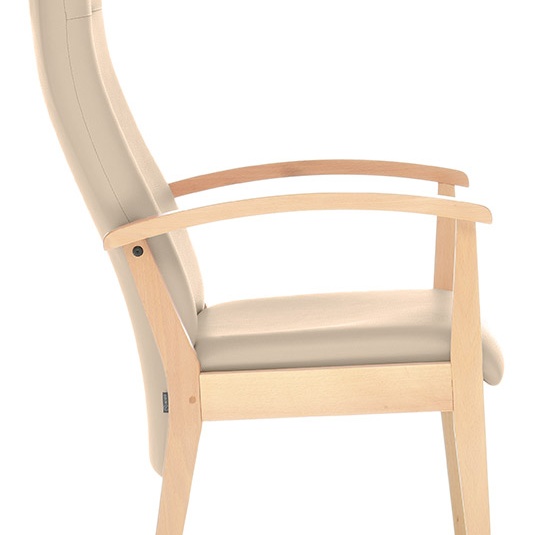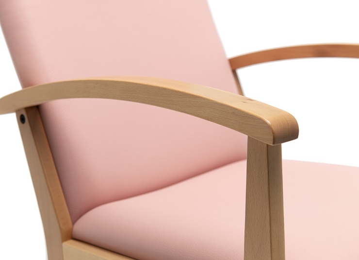 Jolka est un fauteuil stable et confortable. Le dossier ergonomique, qui confère en outre du caractère au fauteuil, et la large assise arrondie à l'avant assurent la stabilité en position assise. On se sent bien, à l'aise et en sécurité, et on a beaucoup d'espace pour s'asseoir. L'un dans l'autre, le siège est confortable, ce qui permet de se détendre ou d'échanger agréablement avec d'autres personnes dans un groupe. Pour se lever, on peut s'appuyer en toute confiance sur les accoudoirs arrondis. Le fauteuil est proposé en chêne et en noyer teinté et laqué. Pour le revêtement, il existe un choix de belles couleurs et de motifs. Tous les cuirs synthétiques Health & Care proposés sont qualifiés pour une utilisation dans le domaine des soins.
