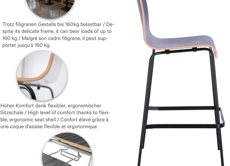 La chaise de séminaire professionnelle Paula est disponible en deux versions de piètement : luge ou quatre pieds, chacune en noir ou en chrome. Elle est également proposée en option sous forme de tabouret de bar avec un piètement à quatre pieds. La coque d’assise flexible en bois moulé ou en stratifié, avec chant multiplex et revêtement HPL, offre un grand confort d’assise et une résistance exceptionnelle. La chaise est empilable, en option raccordable, et adaptée à une utilisation dans les espaces publics. Malgré son design fin, elle supporte jusqu’à 160 kg, ce qui la rend idéale pour une utilisation dans le secteur tertiaire.Numéro d'article