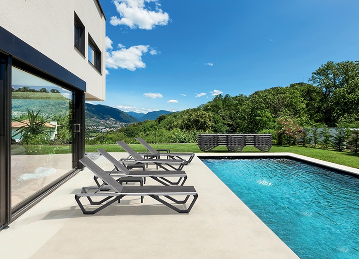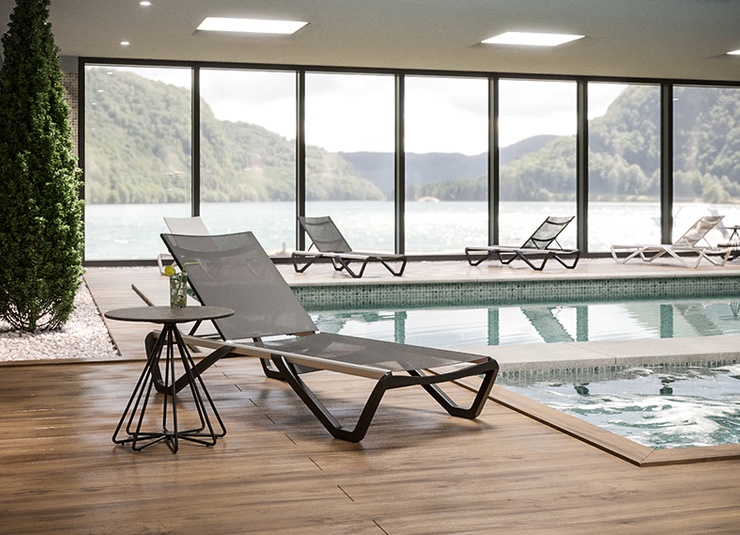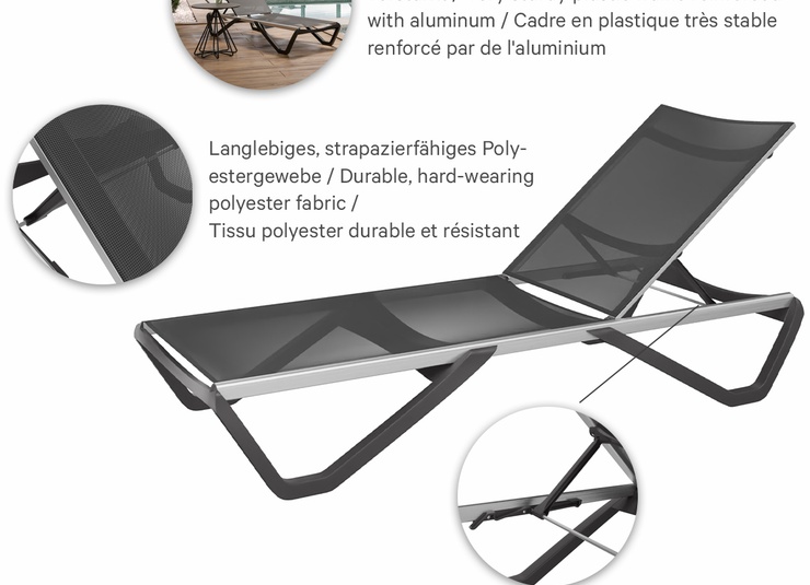 La chaise longue empilable Soliana est élégante et légère grâce au matériau utilisé et à la forme. La structure est en polypropylène renforcé de fibres de verre et aluminium anodisé, la surface de couchage est en tissu technique polyester. Soliana est disponible dans les coloris anthracite, taupe et blanc. La chaise longue est montée sur roulettes et possède un dossier réglable.Numéro d'article