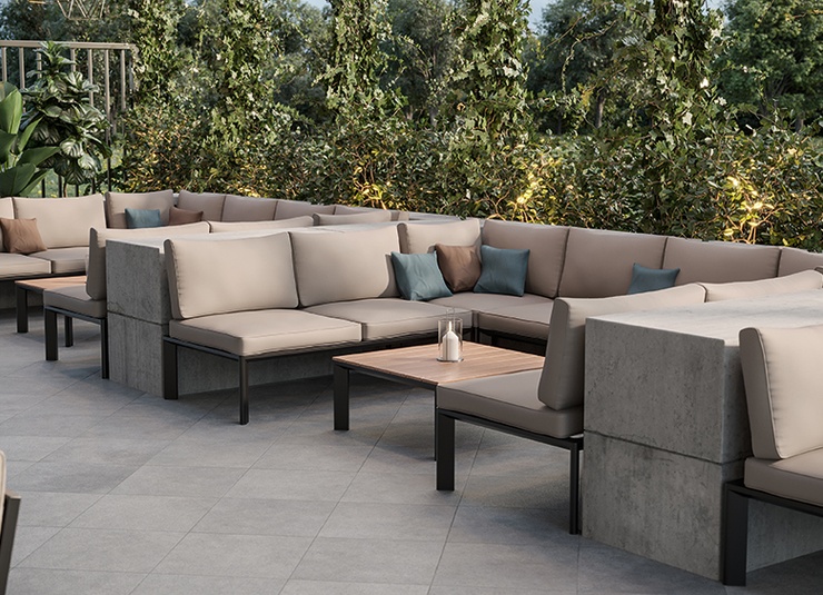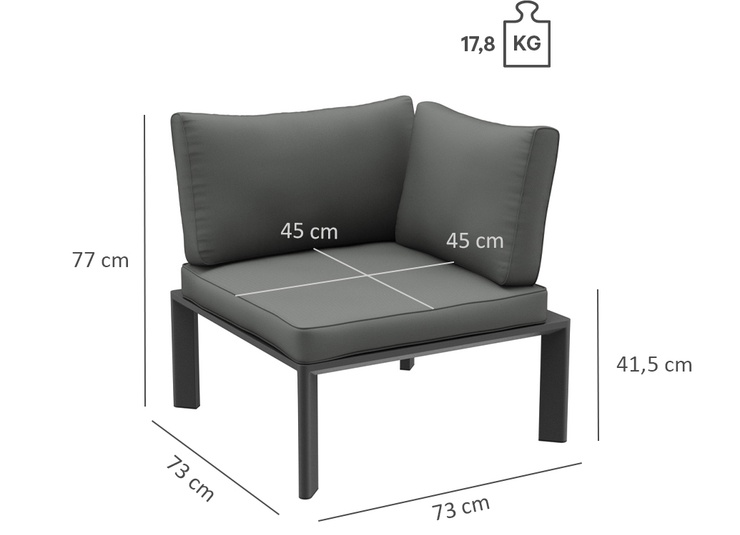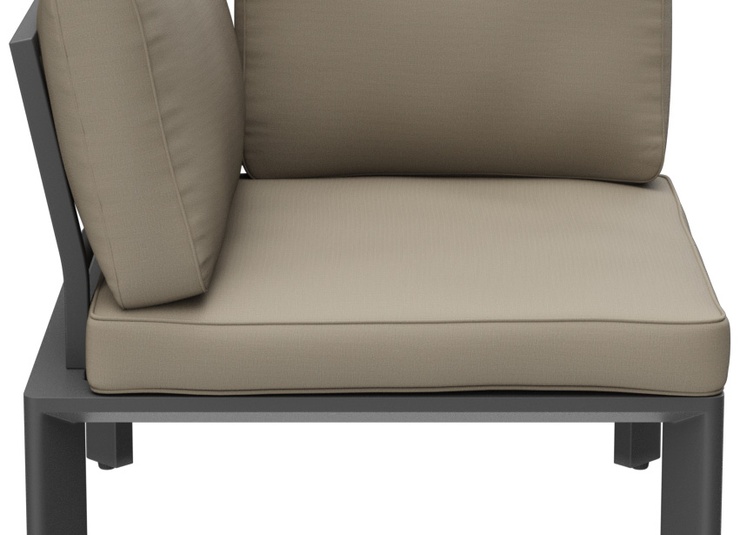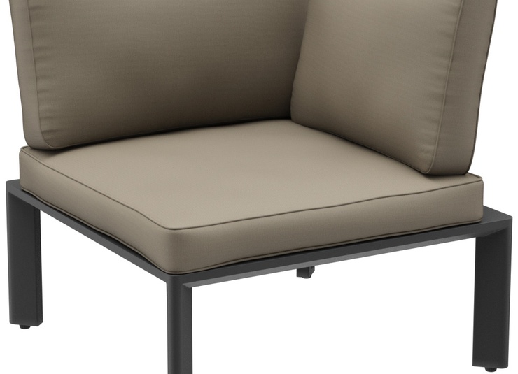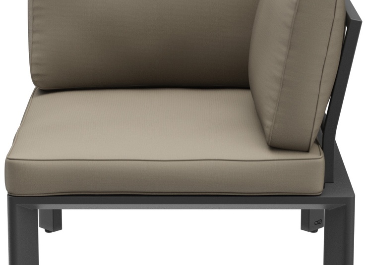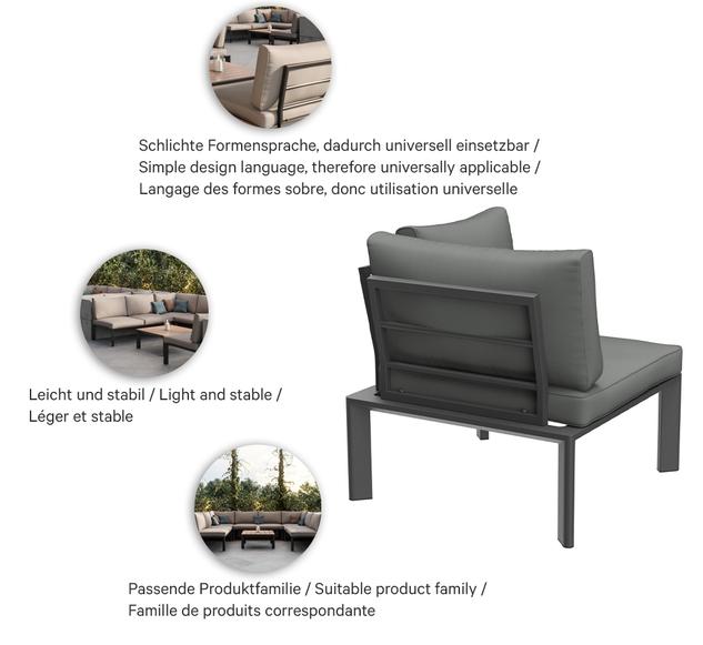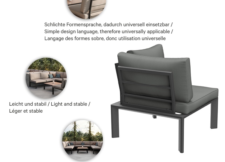 Épuré, simple et intemporel – ce système de salon moderne pour l’extérieur s’intègre facilement dans des environnements variés grâce à son design discret, tant en termes de forme que de couleur. Des lignes nettes, des coussins attrayants et un mélange harmonieux de couleurs et de matériaux assurent une apparence accueillante. Les coussins d’assise et de dossier sont munis de housses amovibles et lavables en tissu SUNBRELLA ou LISO. Ils doivent être protégés de l’humidité et stockés au sec lorsqu’ils ne sont pas utilisés. Rangez les coussins à l’intérieur et assurez-vous qu’ils soient complètement secs avant de les couvrir ou de les ranger. Notre tissu d’extérieur Liso, en acrylique teint dans la masse, est résistant aux UV, durable (20 000 cycles Martindale) et résistant aux intempéries. Le tissu est déperlant (colonne d’eau de 1 000 mm) et facile d’entretien grâce à son traitement anti-taches.Numéro d'article