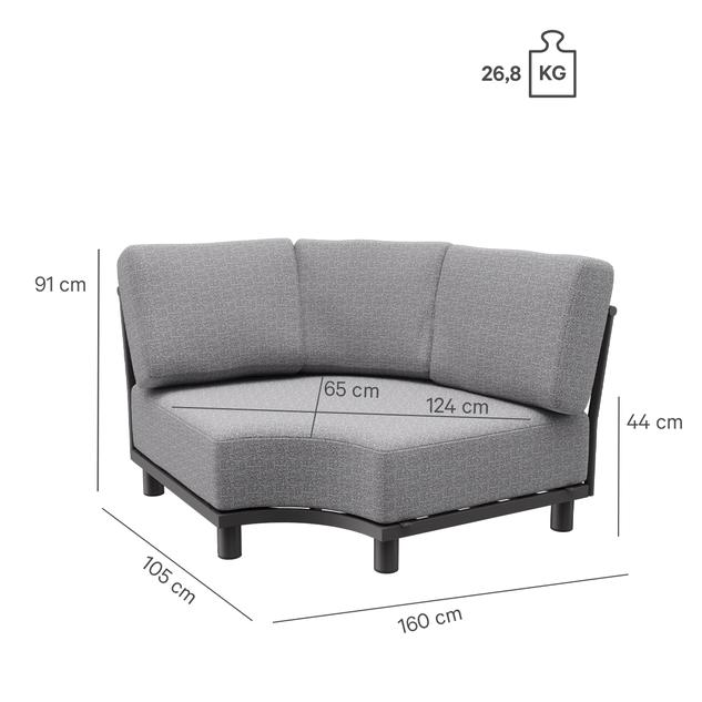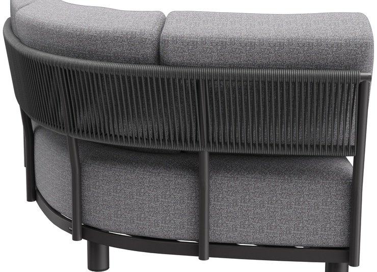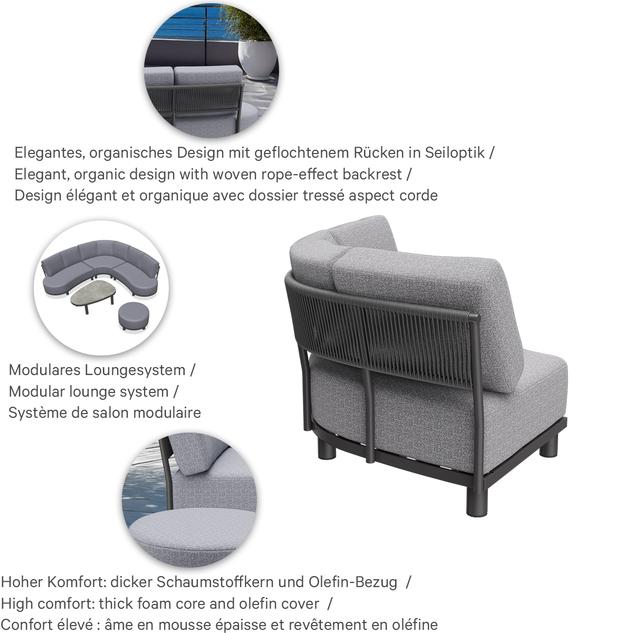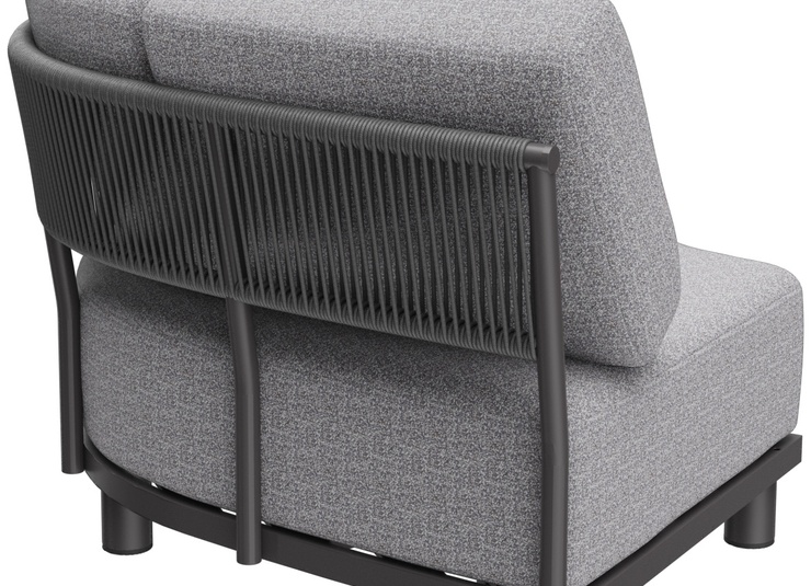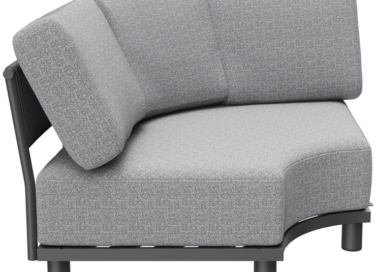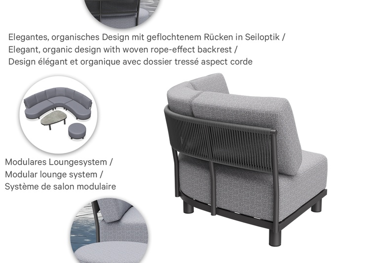 La série lounge Sivonda allie une résistance aux intempéries adaptée à l’extérieur à un design qui fonctionne tout aussi bien dans les intérieurs de lobby, de bar ou de restaurant. Un bloc de mousse très épais dans l’assise et le tissu outdoor de haute qualité en oléfine garantissent un confort d’assise durablement élevé dans les espaces à forte fréquentation. La structure en aluminium thermolaqué et le tressage synthétique réalisé à la main au niveau du dossier, aspect corde, confèrent au lounge une allure légère et élégante. La forme organique crée une atmosphère accueillante et chaleureuse. Pour en profiter longtemps, nous recommandons de stocker les coussins d’assise et de dossier au sec à l’intérieur lorsqu’ils ne sont pas utilisés et de ne les ranger ou couvrir qu’une fois complètement secs. Disponible en module 2 places gauche, module 2 places droite, élément d’angle, pouf et table basse pour des compositions lounge flexibles.- Confort outdoor haut de gamme grâce à un noyau en mousse épais et un revêtement en oléfine pour l’usage professionnel