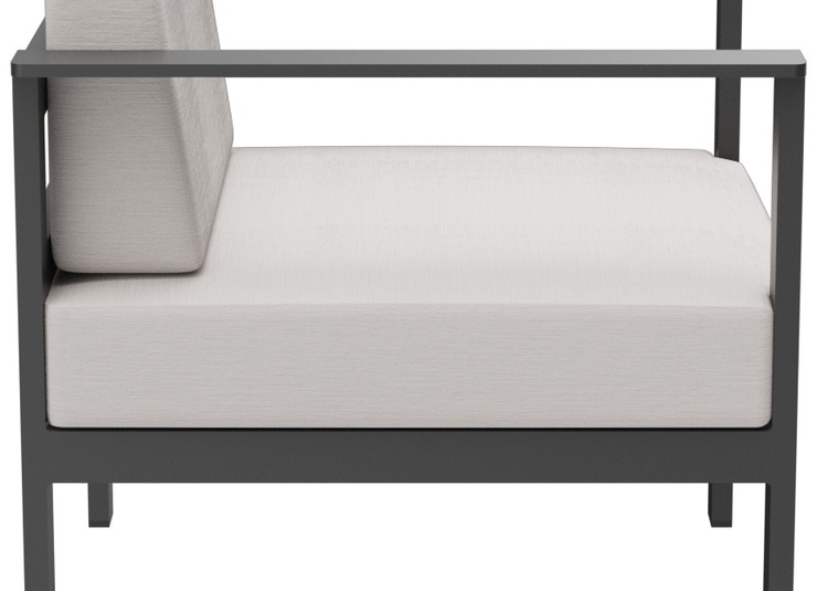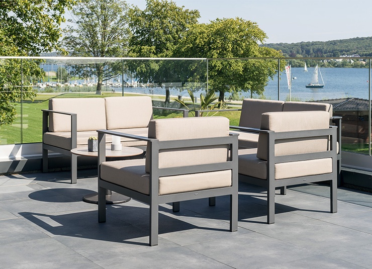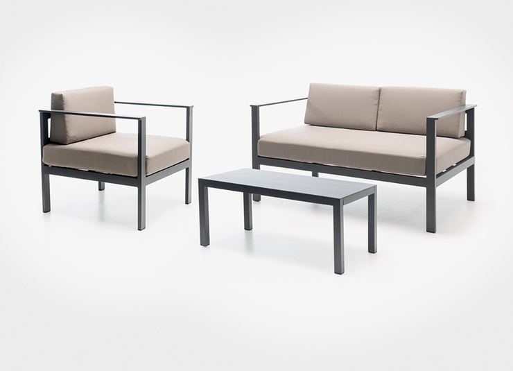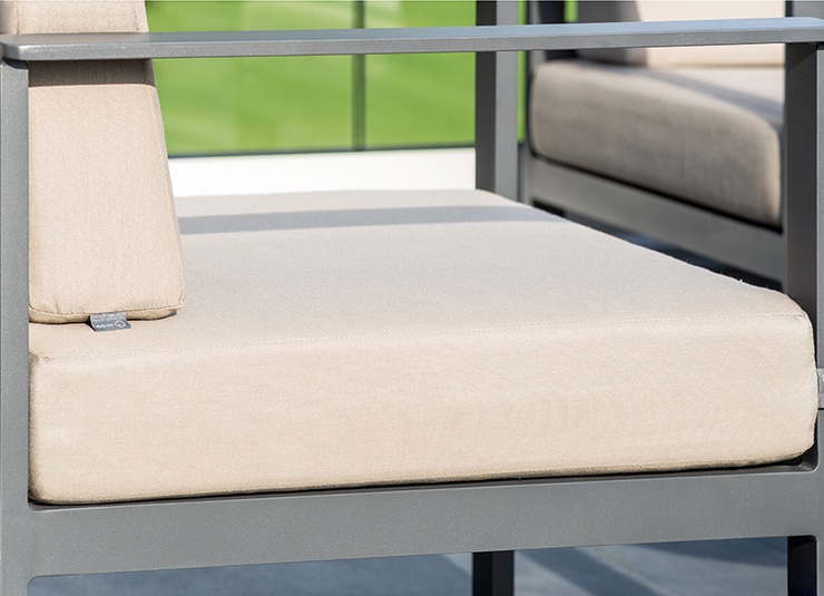 Le salon de jardin Sorelia se compose d’un fauteuil, d’un canapé deux places et d’une table basse avec un plateau en verre. La structure est en aluminium thermolaqué de couleur anthracite. Les coussins d’assise et de dossier sont dotés de housses amovibles et lavables, en tissu SUNBRELLA ou LISO. Ils doivent être protégés de l’humidité et rangés au sec lorsqu’ils ne sont pas utilisés. Conservez les coussins à l’intérieur et assurez-vous qu’ils soient complètement secs avant de les stocker ou de les couvrir. Notre tissu d’extérieur Liso, en acrylique teint dans la masse, est résistant à la lumière, durable (20 000 cycles d’abrasion) et résistant aux intempéries. Il est déperlant (colonne d’eau de 1 000 mm) et facile d’entretien grâce à son traitement anti-taches.