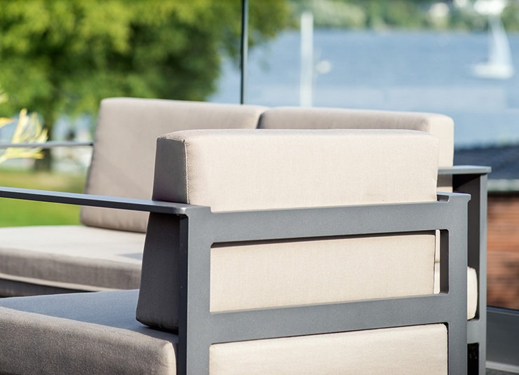 Le tissu d'extérieur Liso de qualité supérieure est composé à 100 % de fibres acryliques teintes dans la masse et convainc par sa résistance exceptionnelle aux couleurs et aux intempéries. Les pigments de couleur sont profondément ancrés dans le fil, ce qui rend le tissu particulièrement résistant à la lumière du soleil, à l'humidité et aux micro-organismes. Une colonne d'eau de 1000 mm ainsi qu'un traitement spécial anti-taches rendent Liso hydrofuge et particulièrement facile d'entretien. Le tissu est résistant, durable et idéal pour une utilisation quotidienne, que ce soit à l'intérieur ou à l'extérieur. Découvrir maintenant !