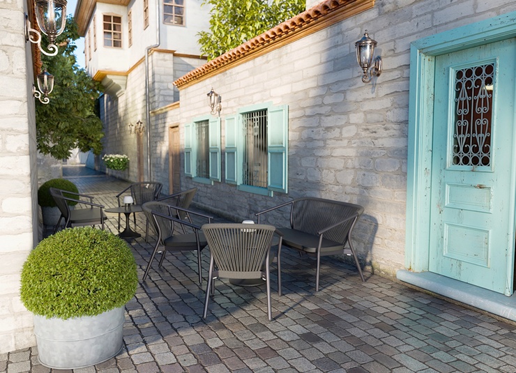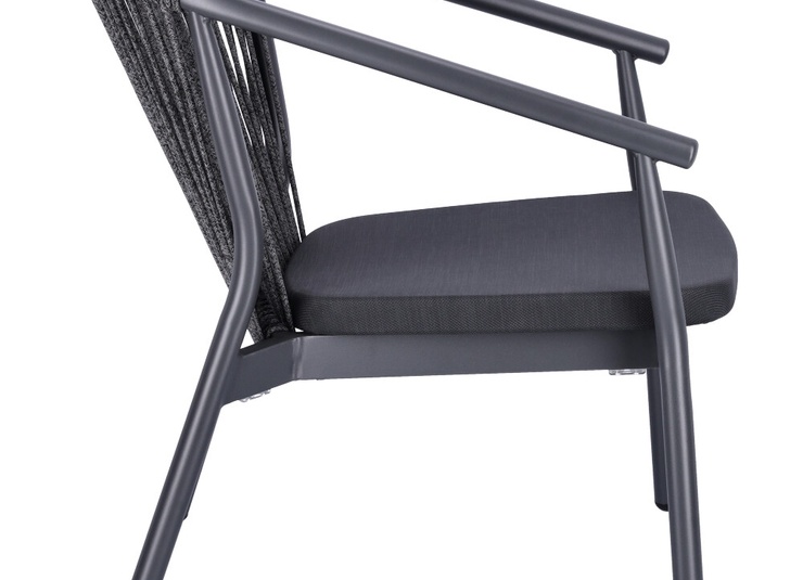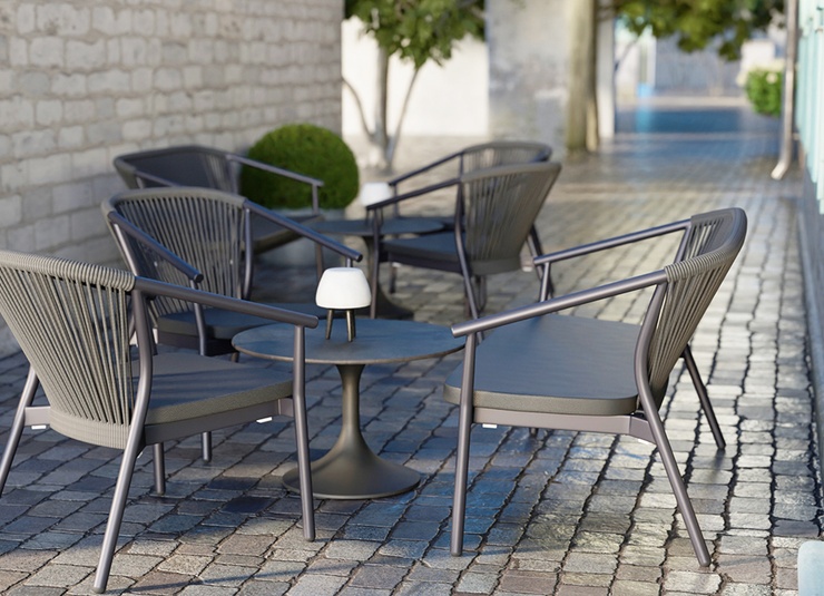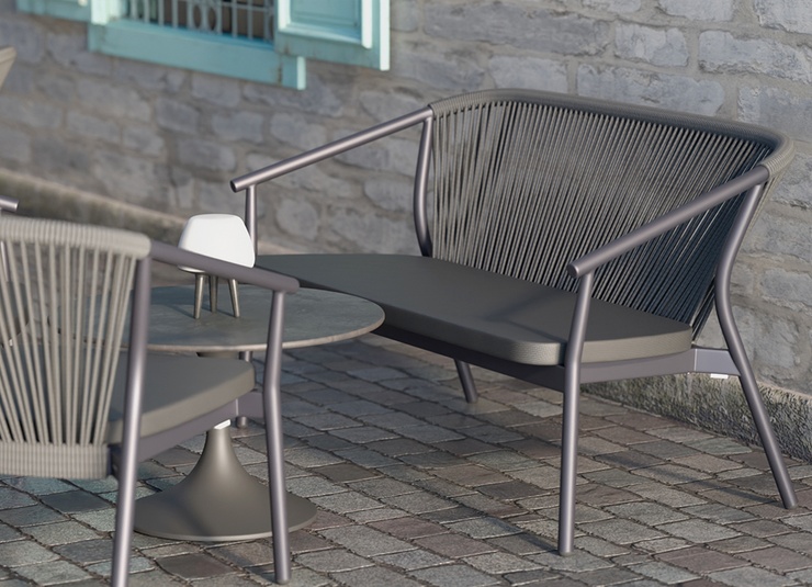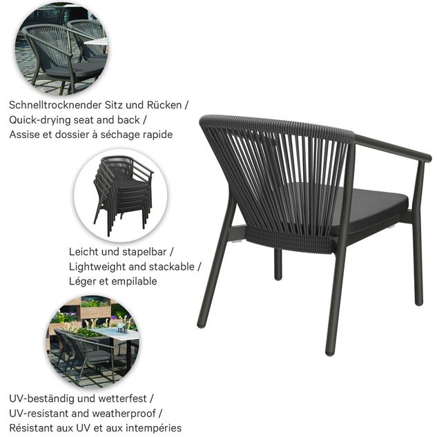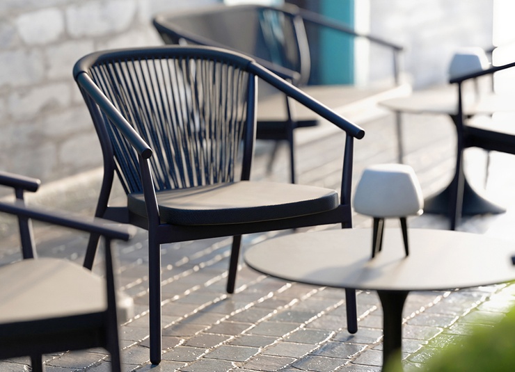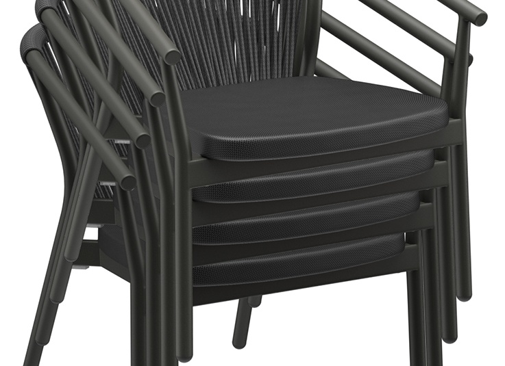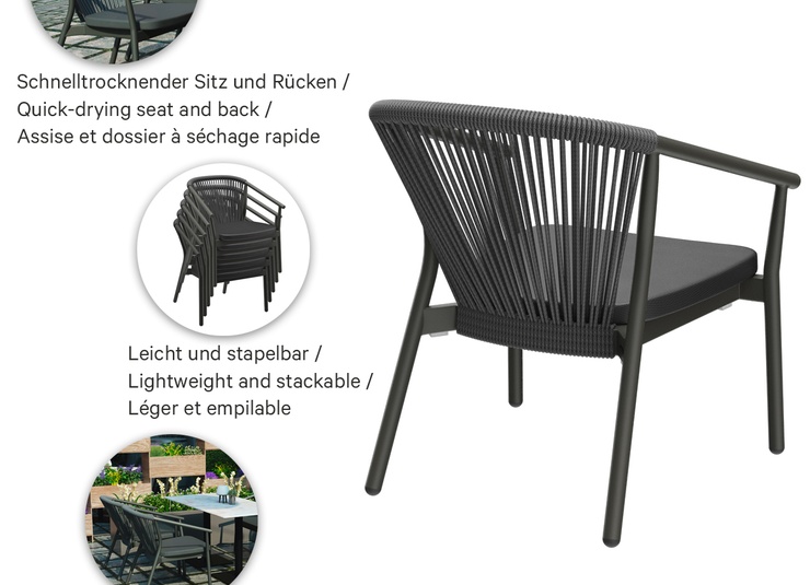 La série d’extérieur Zaki comprend un fauteuil avec accoudoirs, un fauteuil lounge et un lounge 2 places avec un cadre en aluminium thermolaqué. Tous les modèles sont empilables, faciles à manipuler et donc idéaux pour les établissements avec des changements de configuration fréquents et un espace de stockage limité. Les assises en Textilène et les dossiers en tressage de corde sèchent rapidement et n’absorbent pas l’eau – parfaits pour une utilisation continue en extérieur. Les matériaux sont faciles d’entretien, résistants aux UV et aux intempéries, ce qui réduit au minimum les besoins de maintenance. La série convient donc particulièrement à la restauration, à l’hôtellerie et aux espaces contractuels exigeants à forte fréquentation.- Structure en aluminium empilable et légère pour une manipulation flexible et un rangement peu encombrant.