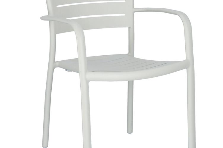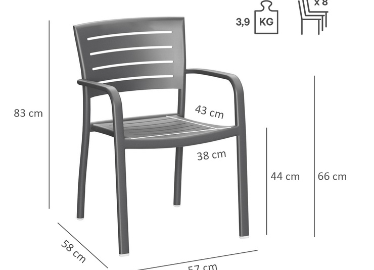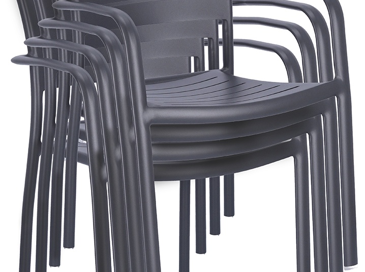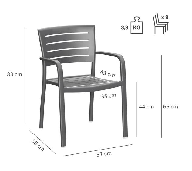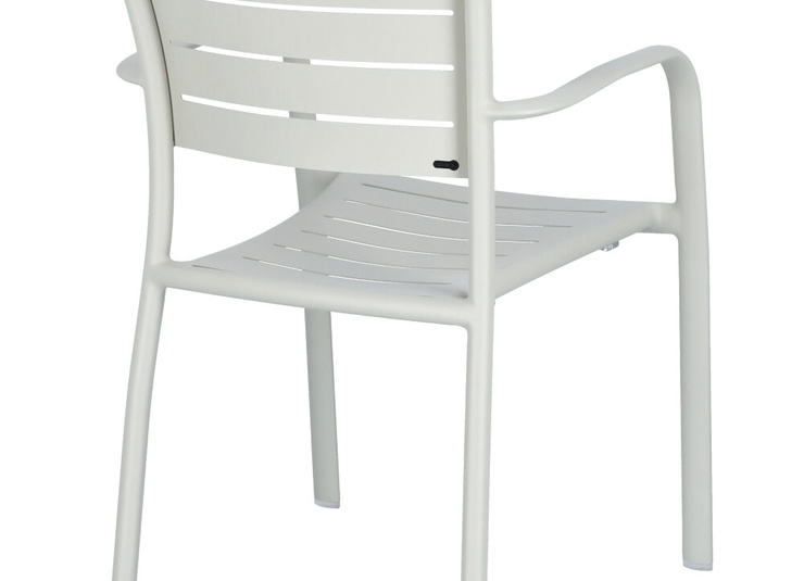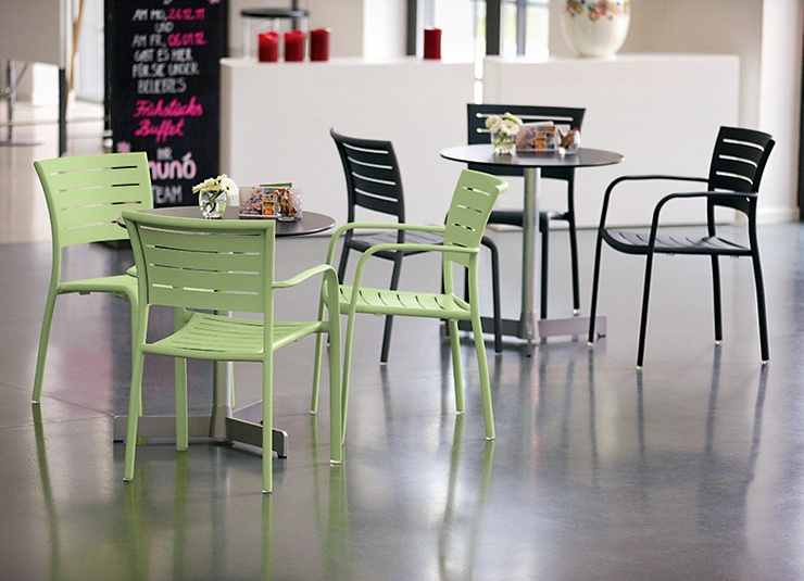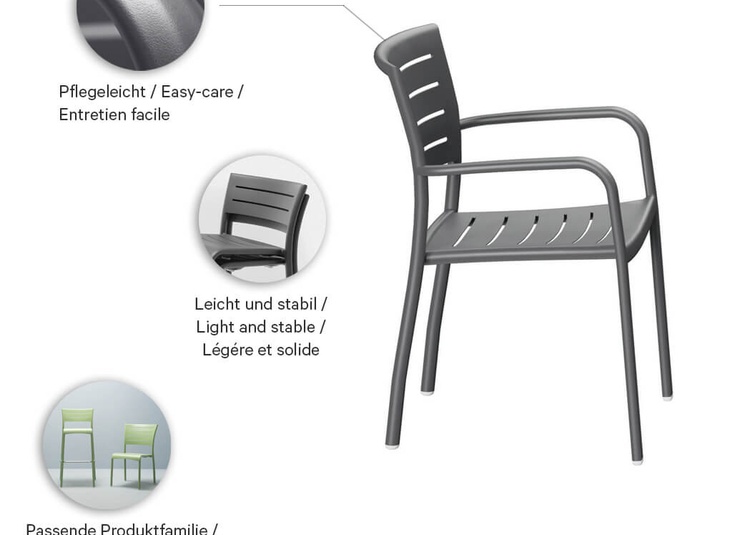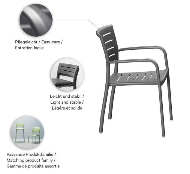 Le modèle Helke, disponible comme chaise, chaise à accoudoirs et tabouret de bar, se distingue par les lamelles et la forme légèrement courbée du dossier. Le siège empilable est en aluminium peint par poudrage et disponible en différentes couleurs.Numéro d'article