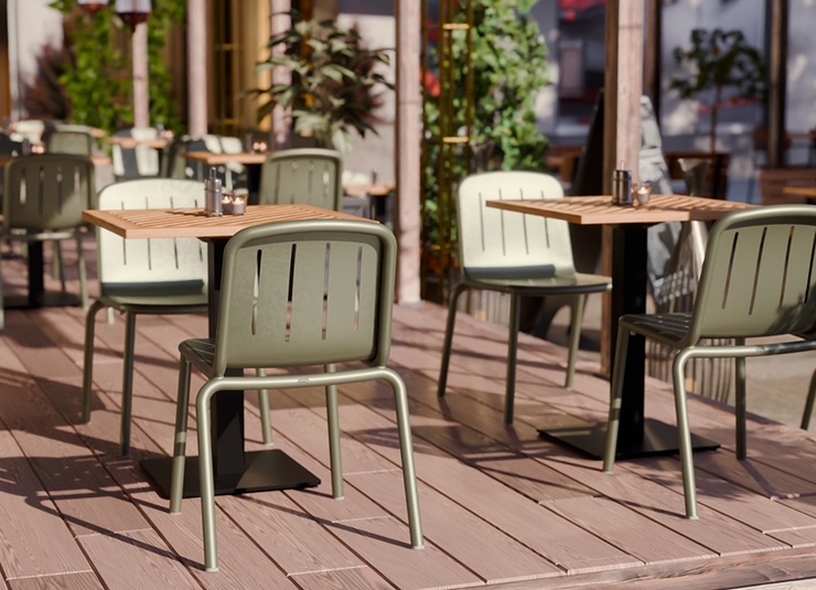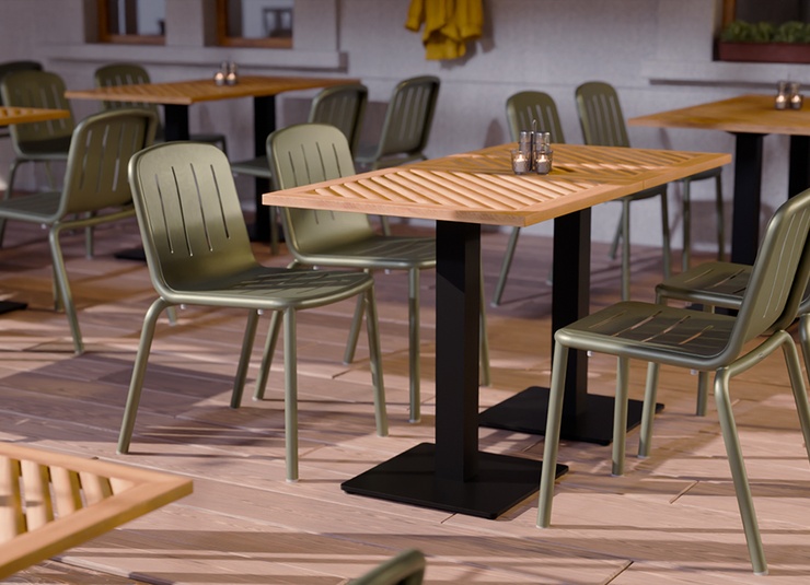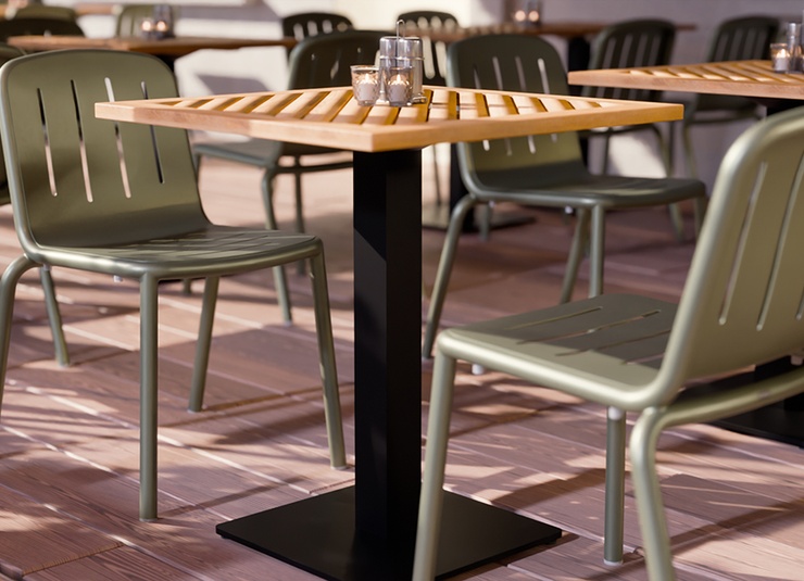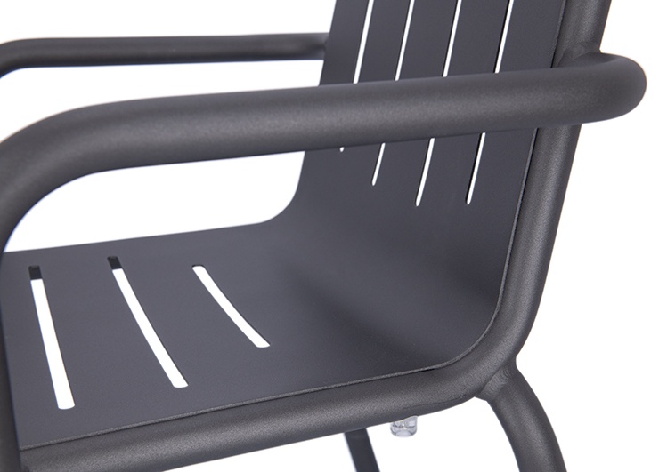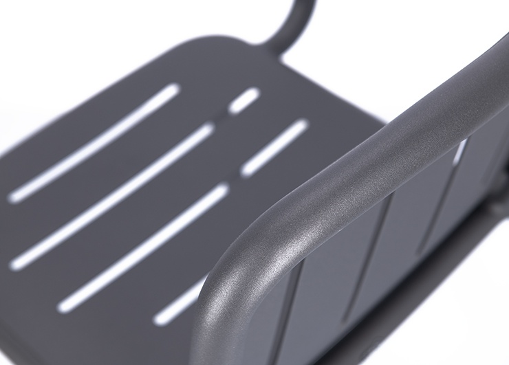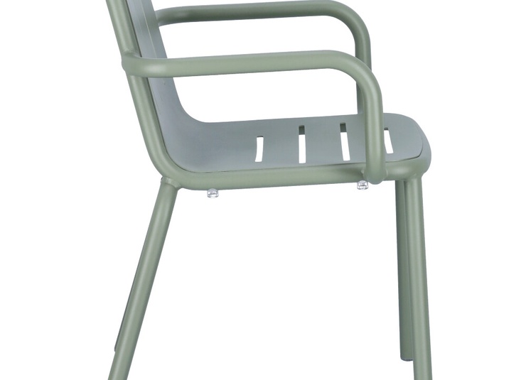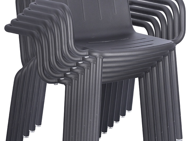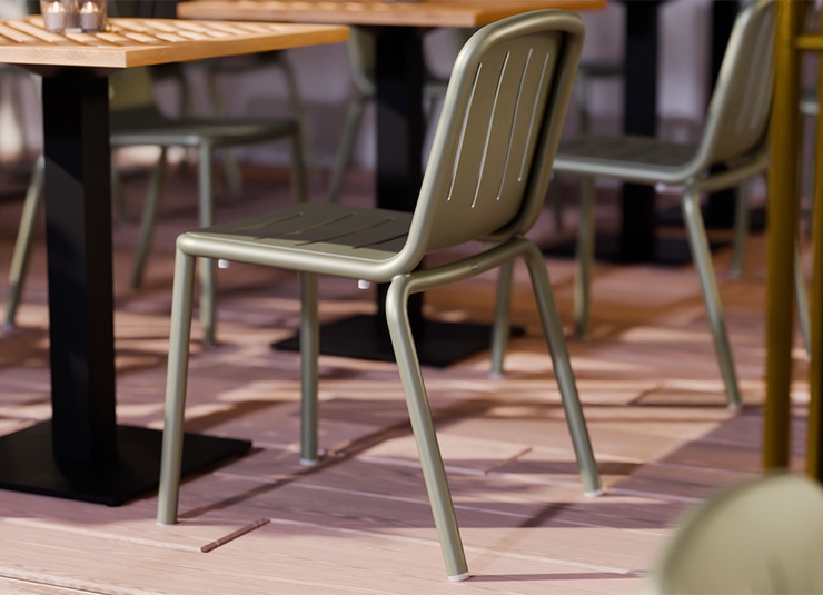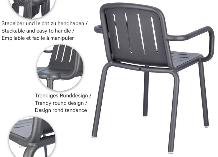 Le modèle Hivo en aluminium thermolaqué est particulièrement facile à manipuler et conçu pour un usage professionnel intensif. Le design rond et tendance avec des fentes horizontales sur l’assise et des fentes verticales dans le dossier offre une apparence moderne et permet à l’eau de pluie de s’écouler efficacement en extérieur. Le piètement, particulièrement remarquable, épouse élégamment et presque sans couture l’assise et le dossier, donnant à la chaise une ligne continue et très haut de gamme. Le matériau résistant aux UV et aux intempéries garantit une longue durée de vie sur la terrasse, le balcon et à l’intérieur, tout en restant facile à nettoyer. Les patins transparents et la possibilité d’empiler la chaise et la chaise avec accoudoirs rendent le modèle encore plus pratique et de qualité.- Facile à manipuler, empilable et en aluminium thermolaqué – robuste et facile d’entretien.