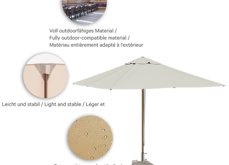 Le noble : avec sa structure complète, en aluminium à l'aspect bois noble, combinée à un toit de couleur naturelle, le parasol Luana est particulièrement noble. Le mécanisme d'ouverture à poulie facilite la manipulation. Grâce à la toile en polypropylène et au renforcement de la toile à l'extrémité de chaque baleine, le parasol est robuste et durable. Luana a une envergure de 3,0 x 3,0 mètres et offre une protection contre les UV à hauteur LSF 80 selon la norme UV 801. La toile peut être retirée et lavée. Il existe un socle de 50 kilogrammes assorti au parasol et doté d'une fonction trolley.Numéro d'article