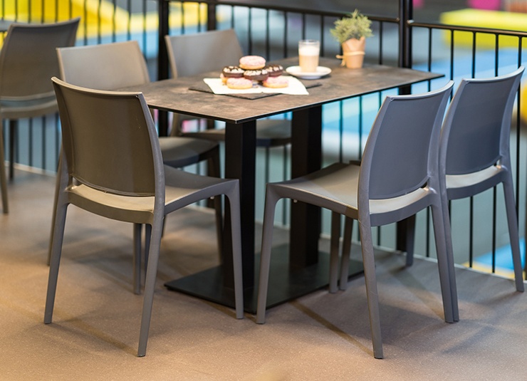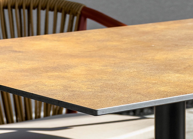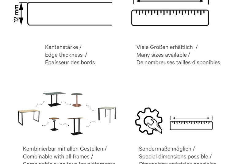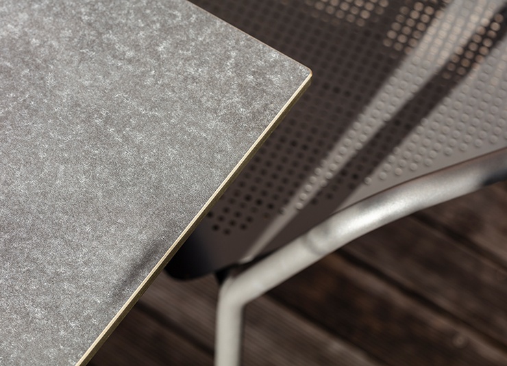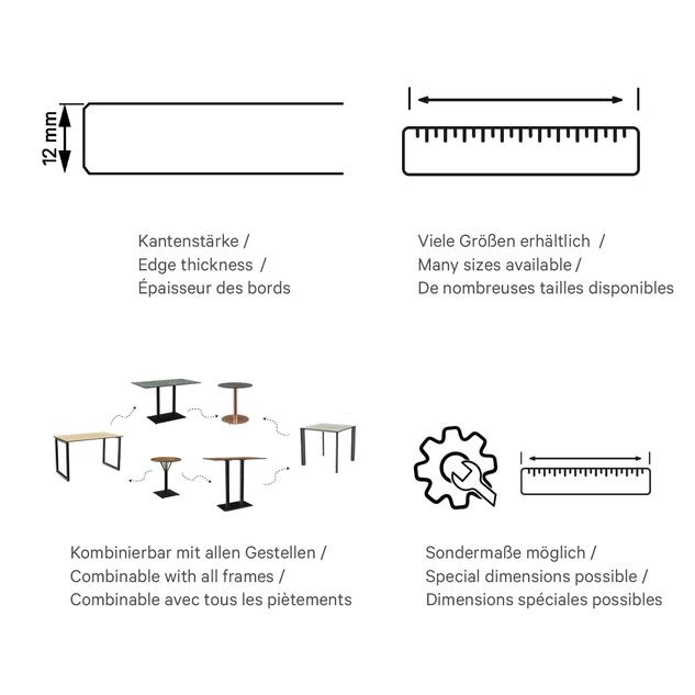 Le plateau fin Compact Slim se distingue par des décors attrayants et peut être utilisé à l’intérieur comme à l’extérieur. La surface facile à entretenir en stratifié de haute densité HPL (High Pressure Laminate) résiste aux UV et présente une résistance équivalente à celle du matériau utilisé pour les plans de travail de cuisine selon la norme DIN EN 438. Ce plateau antichoc est disponible avec 16 décors et en forme carrée, ronde et rectangulaire : des formes et des dimensions spéciales sont également possibles. La couleur du bord est indépendante de la forme et du décor.Numéro d'article