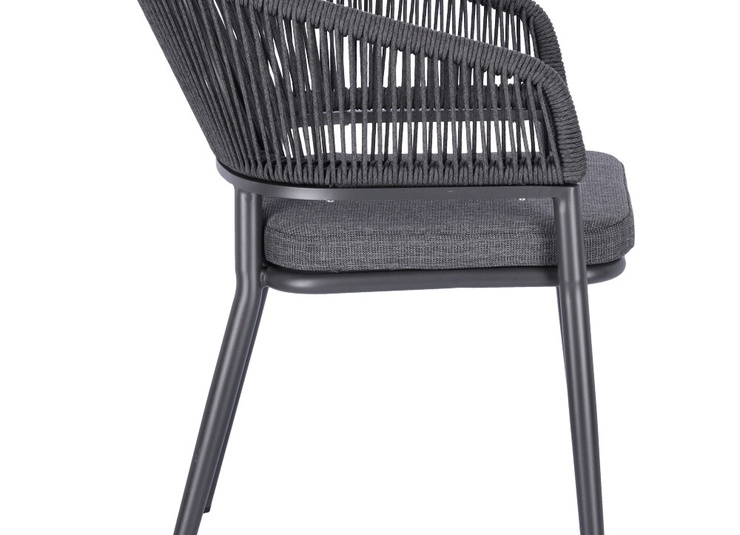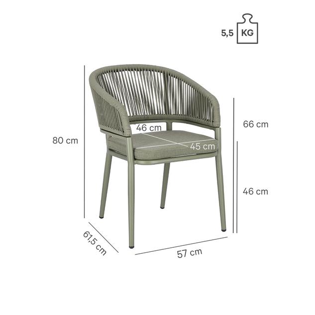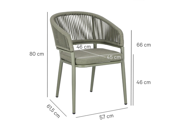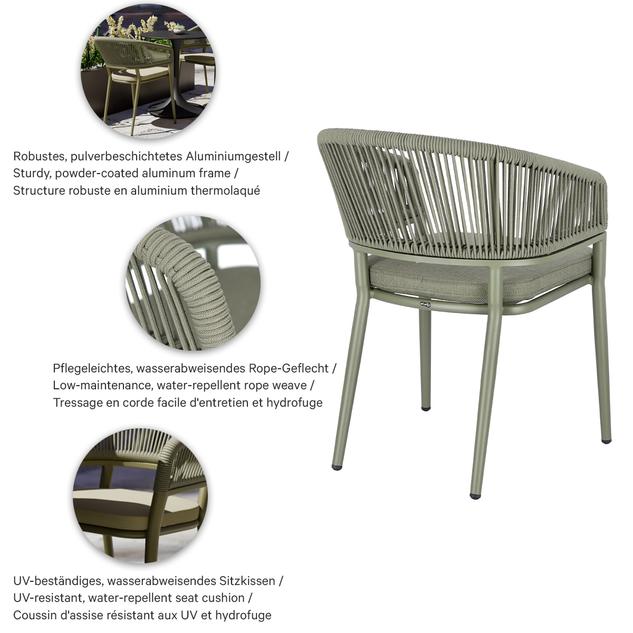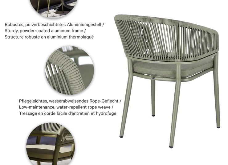 Le fauteuil d’extérieur Mavilo associe une structure légère et robuste en aluminium thermolaqué à une excellente résistance aux intempéries. Le tressage en corde tout autour du dossier et des côtés caractérise le design et confère au fauteuil une apparence moderne et accueillante. La structure, le tressage et le coussin d’assise sont particulièrement faciles d’entretien et conçus pour une utilisation quotidienne en extérieur. Le coussin d’assise inclus, en 100 % oléfine, est résistant aux UV et déperlant, ce qui le rend idéal pour les terrasses et les brasseries en plein air. Dans l’ensemble, une chaise fonctionnelle et durable qui allie parfaitement confort et praticité.