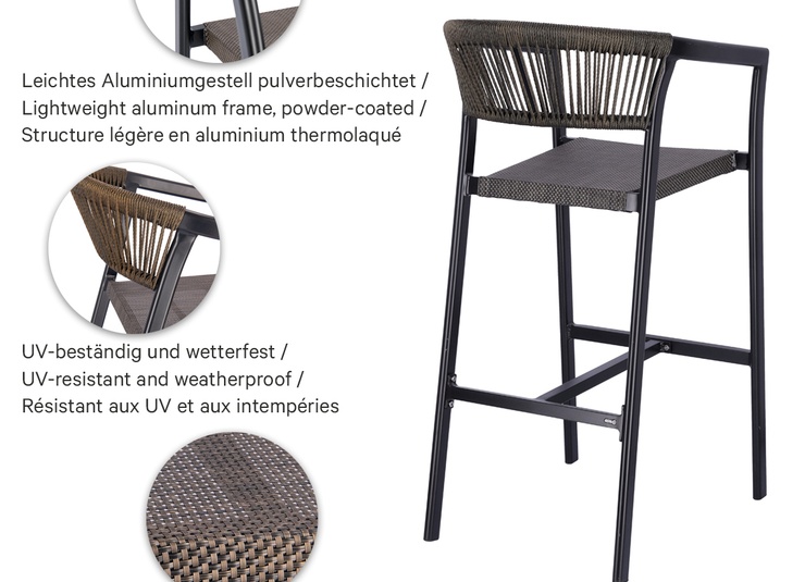 Malida séduit par une structure robuste en aluminium et un revêtement résistant aux intempéries et à séchage rapide – idéal pour une utilisation en extérieur. Des matériaux de haute qualité associés à un rapport qualité-prix imbattable. Parfait pour des moments de détente en plein air – durable, facile d’entretien et d’un style moderne intemporel.- structure en aluminium légère et robuste