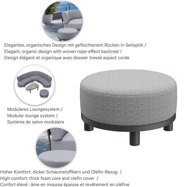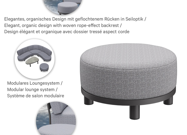 La série lounge Sivonda allie une résistance aux intempéries adaptée à l’extérieur à un design qui fonctionne tout aussi bien dans les intérieurs de lobby, de bar ou de restaurant. Un bloc de mousse très épais dans l’assise et le tissu outdoor de haute qualité en oléfine garantissent un confort d’assise durablement élevé dans les espaces à forte fréquentation. La structure en aluminium thermolaqué et le tressage synthétique réalisé à la main au niveau du dossier, aspect corde, confèrent au lounge une allure légère et élégante. La forme organique crée une atmosphère accueillante et chaleureuse. Pour en profiter longtemps, nous recommandons de stocker les coussins d’assise et de dossier au sec à l’intérieur lorsqu’ils ne sont pas utilisés et de ne les ranger ou couvrir qu’une fois complètement secs. Disponible en module 2 places gauche, module 2 places droite, élément d’angle, pouf et table basse pour des compositions lounge flexibles.- Confort outdoor haut de gamme grâce à un noyau en mousse épais et un revêtement en oléfine pour l’usage professionnel